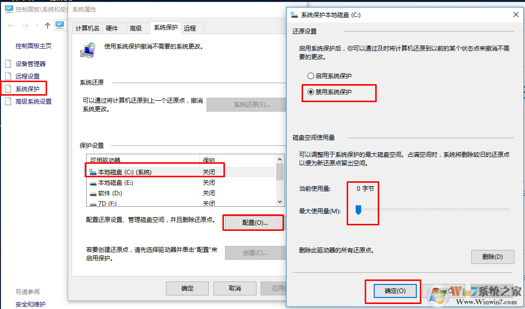 方法:“此电脑”“属性”“系统保护”,点击“配置”“禁用系统保护”,再将磁盘空间使用量设为“0”即可。
