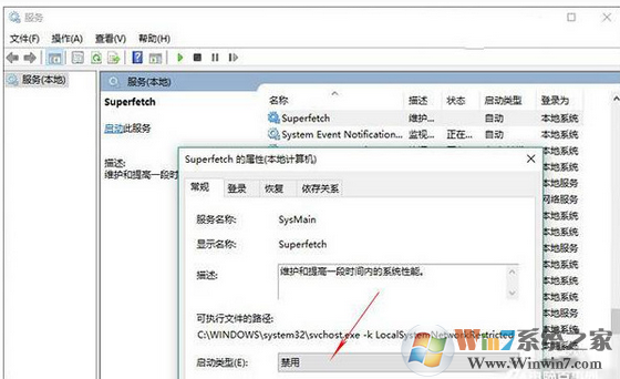 方法:点击Win10任务栏搜索框,输入“服务”进入本地服务列表,查找并双击“Superfetch”,将属性修改为“禁用”,后重启计算机即可。
