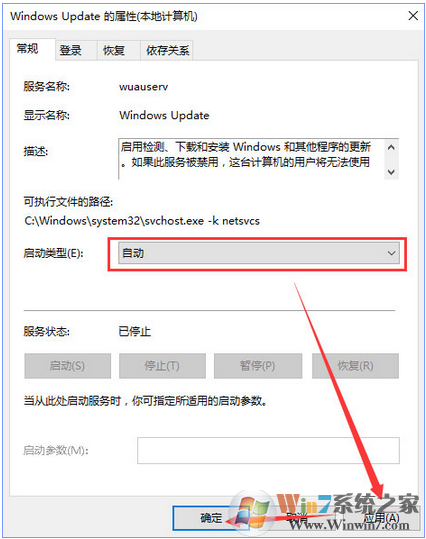3、如果打开后和小编这里显示的一样,服务已停用,那么先将启动类型修改为【自动】,然后点击【应用】【确定】即可,以此类推,确保Windows Firewall,Windows License Manager Service,Network Connection Broker,Windows Store Service (WSService)几个服务都已正常启动;