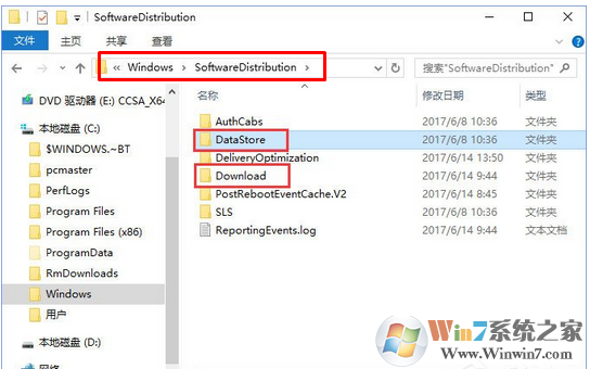 5、打开此电脑,依次展开C:\Windows\SoftwareDistribution 文件夹,在SoftwareDistribution 文件夹中删除DataStore文件夹下的内容和Download文件夹下的内容(若出现无法删除的现象,可参考方法1、2 、3将Windows Update 服务暂停,然后即可进行删除,删除后重新启用Windows update服务即可)。