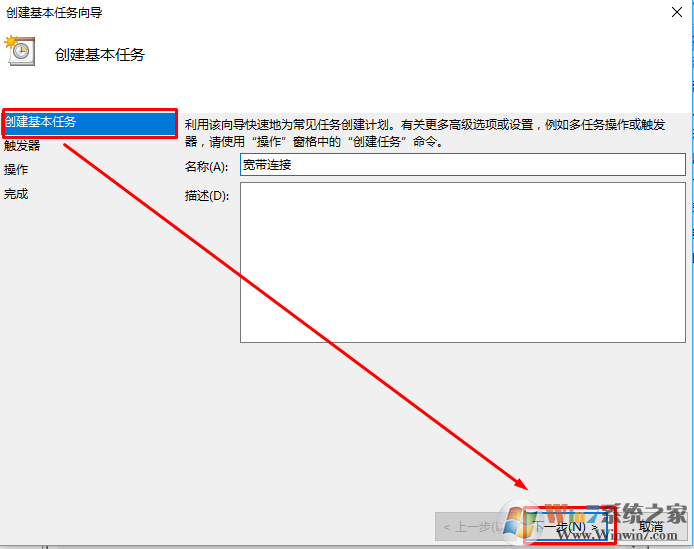 4、在弹出的创建基本任务向导对话框中,在下图标注“1”处键入任务名称如:自动宽带连接,然后点击标注“2”处的“下一步(N)>”按钮。如下图画面所示: