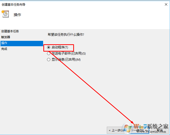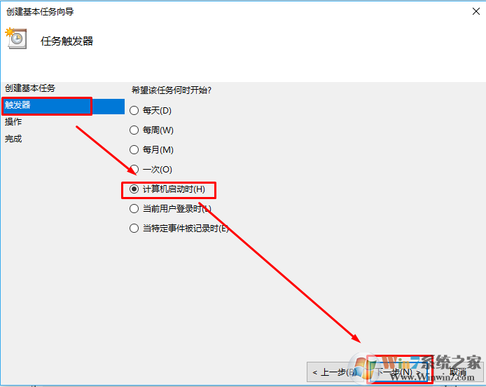 5、选择计划任务启动时间为“计算机”启动时,然后点击下一步,再选择“启动程序”;