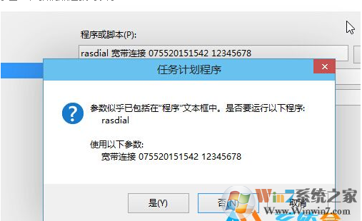 6、在启动程序或脚本设置界面,在标注“1”位置处键入“rasdial 宽带连接 075520151542 12345678”,然后在标注“2”处点击“下一步(N)>”按钮;(其中“宽带连接”为你宽带连接的名字,如果改过那么填改过的名称,075520151542 为宽带帐号 12345678 为密码,注意空格);填好以后点击下一步;