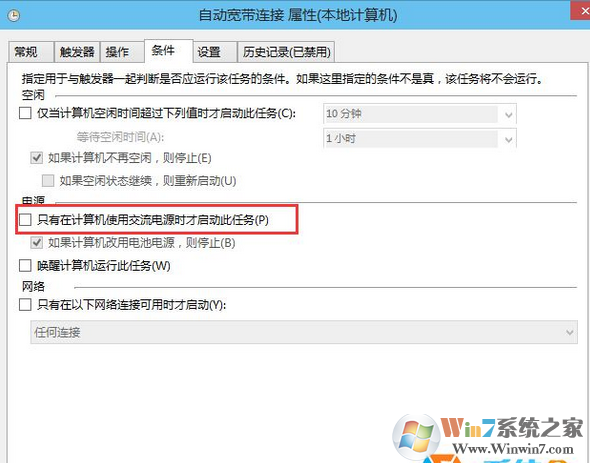 9、最后弹出任务属性,我们切换到“条件”选项卡下,取消勾选“只有在计算机使用交流电时才启动此任务”;(这是为了笔记本用户在没有插电源的情况下可以使用自动拨号);