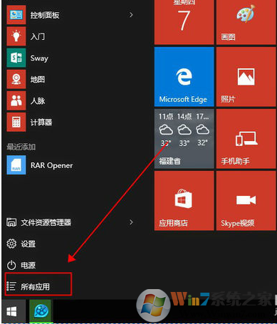 1、在系统菜单弹出的菜单栏里点击所有应用。