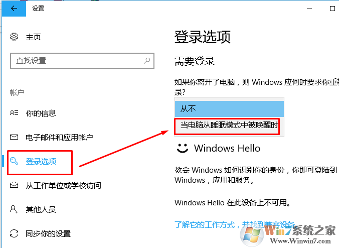 4、在需要登录中选择当电脑从睡眠模式中唤醒,如果是相要取消开机密码的朋友则选择从不。