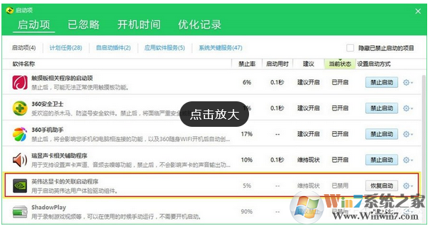 三、打开优化软件,在开机启动项中开启有关于NVIDIA 的所有启动项和服务。