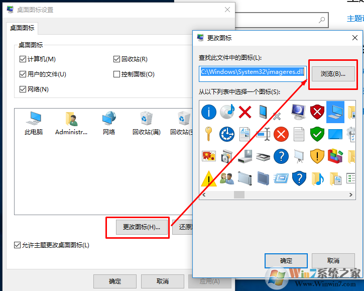 3、我们依次选中回收站(空)/(满),点击【更改图标】,如图所示: