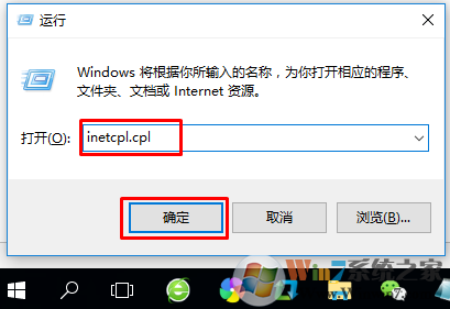 1、在键盘上按下Windows键+R 打开运行框,输入:inetcpl.cpl 点击确定;