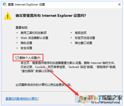 3、在重置 ie 设置框中,勾选【删除个人设置】,点击【重置】按钮;