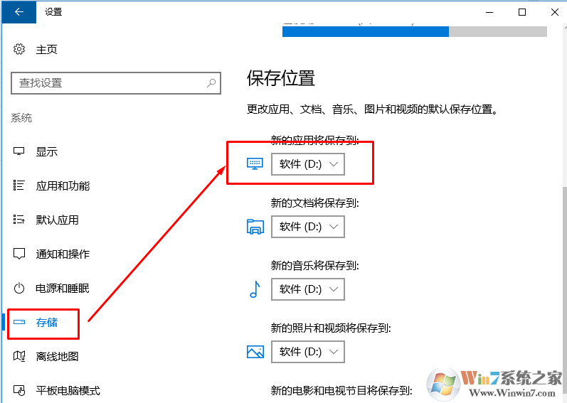 3、选择存储,然后将新安装的应用保存在---这项修改为D盘或者是非系统盘即可。