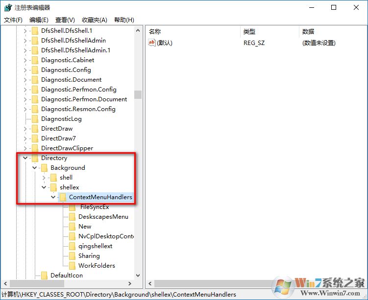 5、双击,找到HKEY_CLASSES_ROOTDirectoryBackgroundshellexContextMenuHandlers