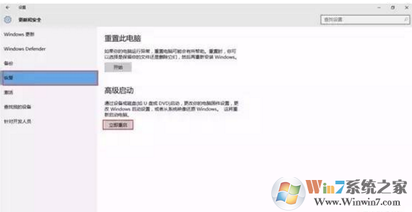 2、“恢复”中点击“立刻重启”这时候电脑会进入“重启”页面