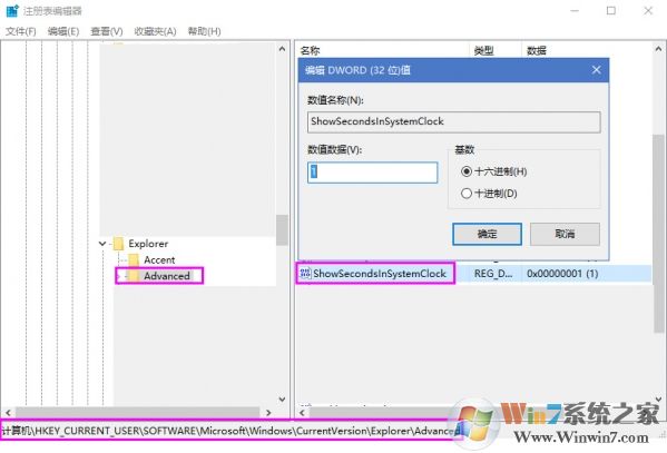 2、在右侧窗口右键点击新建 DWORD(32位)值,并命名为ShowSecondsInSystemClock,双击打开将数值数据改为1,然后重启电脑即可。