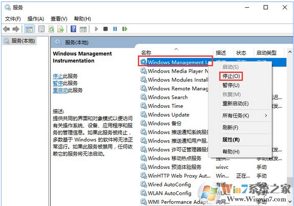 2、找到Windows Management Instrumentation服务,右键,停止;