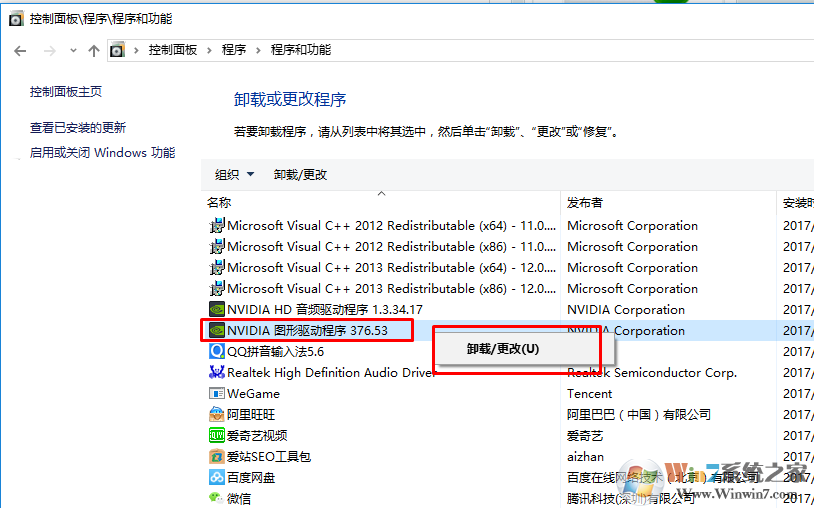 2、在控制面板里将独立显卡驱动或者独立显卡驱动的残留项卸载掉。