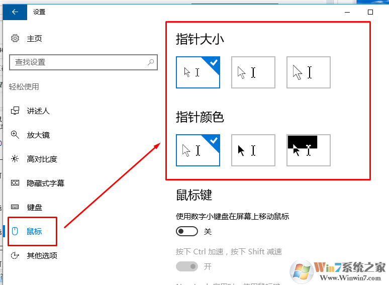 3、选择到鼠标,我们就能看见鼠标指针的颜色和大小设置了。大家可以按照自己的爱好进行设置。