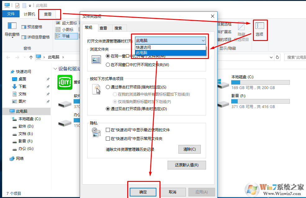 打开我的电脑---查看----将下图红框种的选项选择为此电脑----最后确定即可。