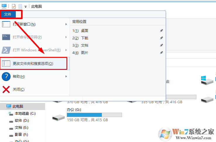 1、打开任意文件夹,点击左上角的“文件”,在弹出的选项中点击“更改文件夹和搜索选项”,如图所示: