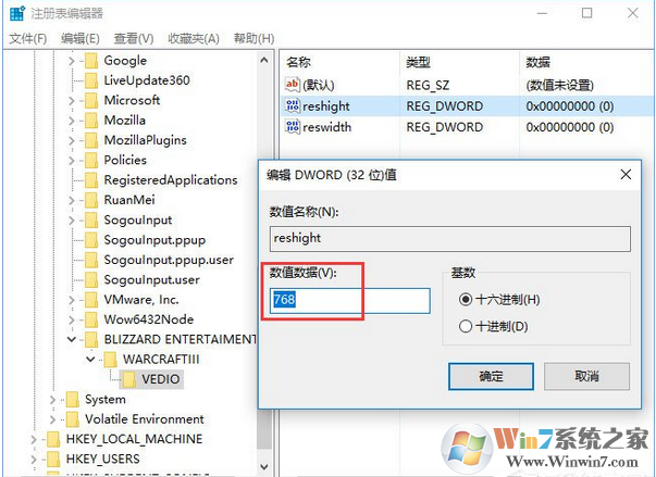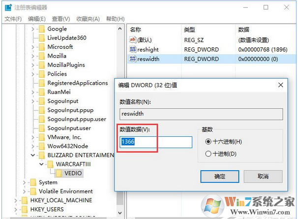 3、打开VEDIO之后,在右侧双击打开reshight(屏幕高度)改成768,双击打开reswidth(屏幕宽度)1366,当然我们可以通过需要修改的分辨率自定义进行修改。