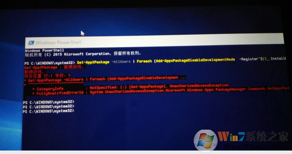 2.  输入“Get-AppXPackage -AllUsers | Foreach {Add-AppxPackageDisableDevelopmentMode  -Register"$($_.InstallLocation)\AppXManifest.xml"}” 然后回车等待