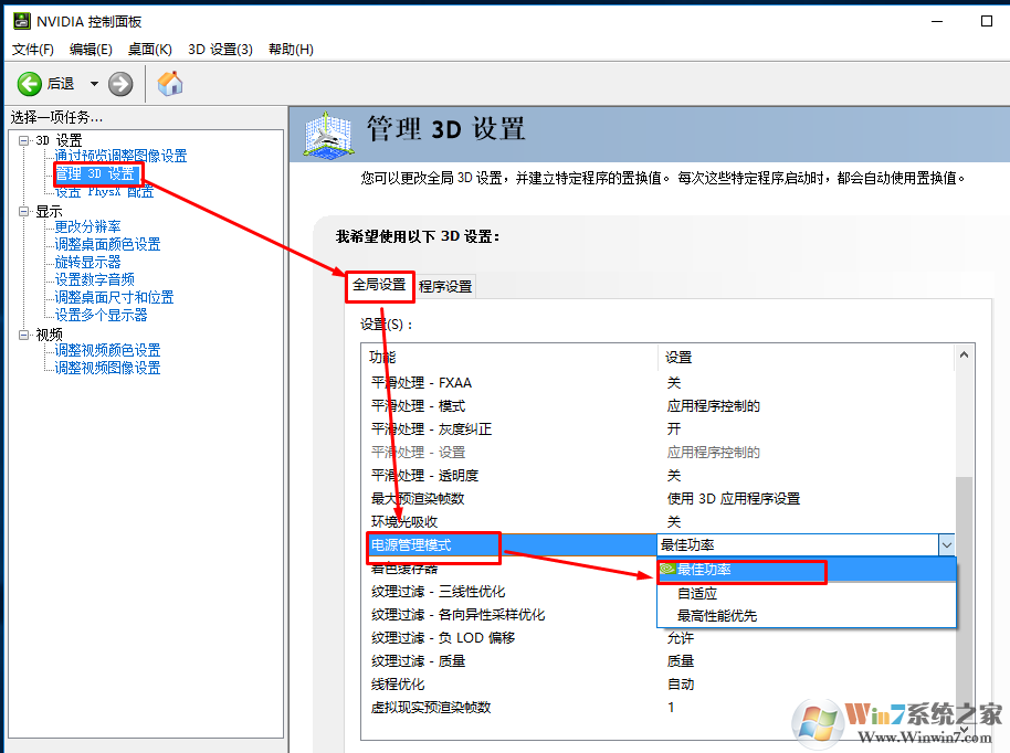 N卡的话,右键进入nvidia控制面板,选择3D设置---全局管理---电源管理模式---最高性能优先。