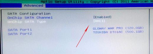 BIOS中也要开启AHCI模式才能发挥SSD的真正运行速度,在进入主板的BIOS后,将“Advanced”→“SATA Type”项目下按下回车键,将SATA字样的选项设置为 AHCI 保存设置即可。不同主板会有不同的名称,但是几乎都是SATA开头。