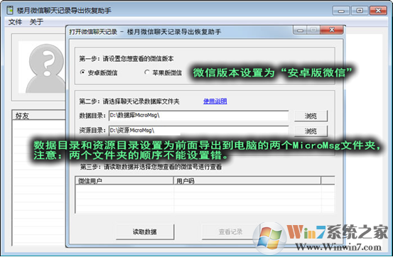 1、,安卓手机中每个登陆的微信号中的微信聊天记录都经过了严格的双向加密,我们需要借助“楼月微信聊天记录导出恢复助手”才可以解密查看里面的所有微信聊天内容。打开该软件后,按下图进行相应设置。设置后点击“读取数据”按钮,然后选择一个想查看的微信号后点击“查看记录”按钮。