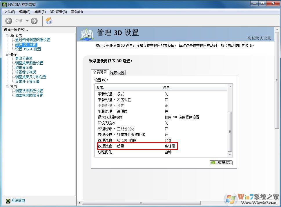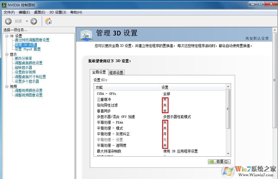 在管理3D设置中将小编标出来的功能关闭,然后把纹理调到高性能模式
