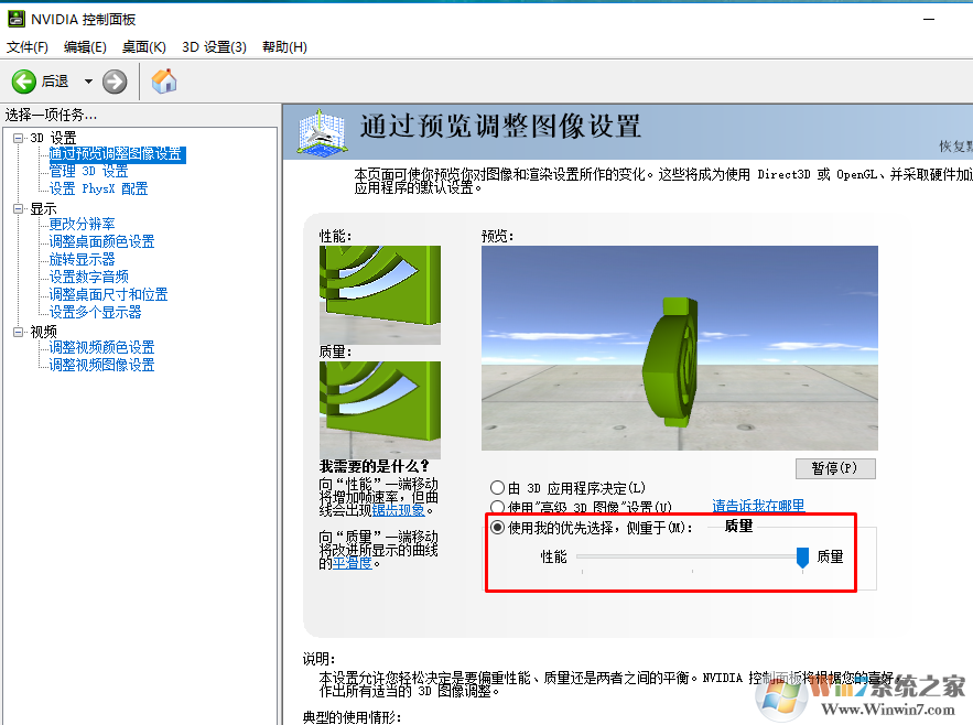 高性能用户的设置方法比较简单,勾选使用的我有限侧重,只需要将总体的画质侧重为质量即可。