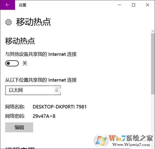 3.先点击“编辑”修改热点的网络名称和网络密码,修改完毕保存后,回到这个界面,点击“与其他设备共享我的Internet连接”下的滑动开关至“开”。