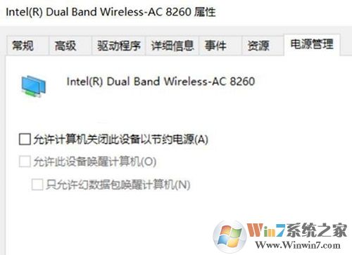 6.双击无线网卡弹出属性对话框,切换到“电源管理”中,取消勾选“允许计算机及关闭此设备以节约电源”。