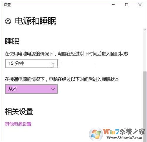 7.按下开始菜单,输入“电源”弹出设置界面,下拉找到“睡眠”,选择“从不”即可(接通电池的情况下还是默认不改为好)。