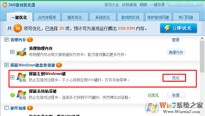 提示:游戏youh优化器中还有很多我们可以利用的优化项目,看自己习惯选择优化即可。游戏完之后点击恢复即可恢复win键使用。