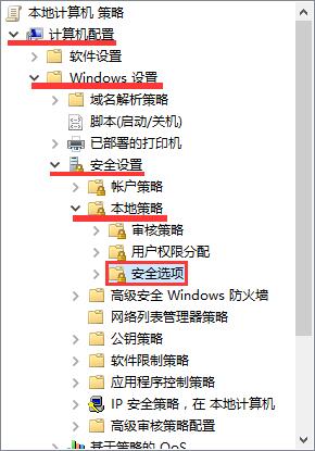 2、依次展开“计算机配置”—“Windows 设置”—“安全设置”—“本地策略”—“安全选项”;
