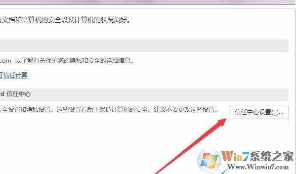 4、在右侧窗口中我们找到Microsoft Word信息中心一项,点击“信任中心设置”按钮,EXCEL也有这个设置的。