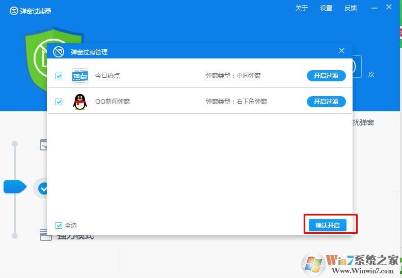 2、然后点击弹窗拦截打开,这时我们再选择开启过滤;