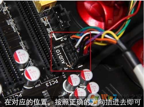 2、音频线,对应机箱面板上的麦克风和耳机插孔,找到主板上的AUDIO 和机箱上过来的线 插上即可,现在的主板和机箱基本都是整个插下去就好了,如下图
