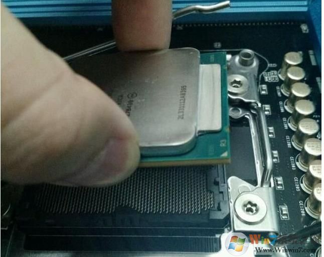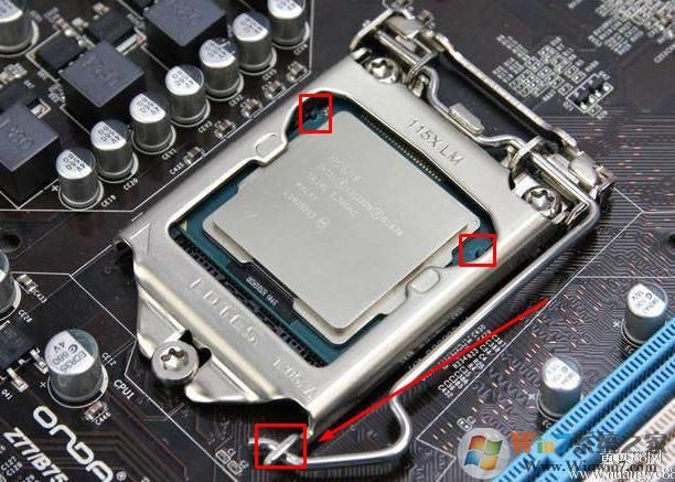 3、拿出CPU,然后安装在主板CPU底座上,注意CPU有凹槽的对应底座上的凸点,安装完成后扣紧CPU底座;