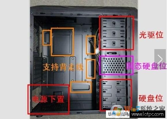 2、打开结构如下,下图分别标注了机箱上什么部位安装什么配件。