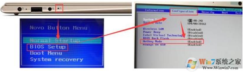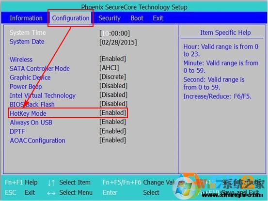 2、进入BIOS后,移动到第二个选项,“Configuration”,找到“Hotkey Mode”热键模式选项,默认为“Enable”开启状态,即F1-F12为媒体功能;