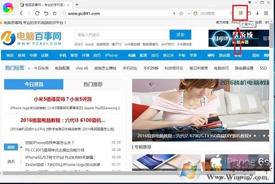 二、打开360极速浏览器,然后点击右上角的“扩展中心”图标,如下图。