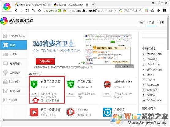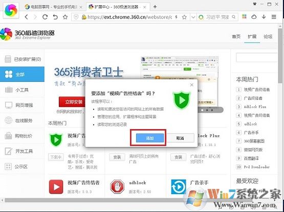 三、进入浏览器扩展中心后,找到一款名为“视频广告终结者”的插件,点击“安装”,然后在弹出的确认提示中,点击“添加”即可。