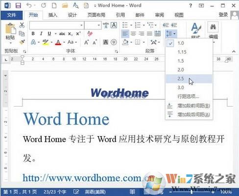 打开Word文档窗口,选中需要设置行距的段落或全部文档。在“开始”功能区的“段落”分组中单击“行和段落间距距”按钮,并在打开的行距列表中选中合适的行距,如图2013082401所示。