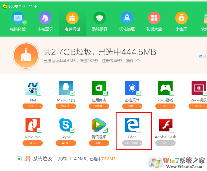 3、等待扫描完成,勾选edge浏览器后点击清理即可。