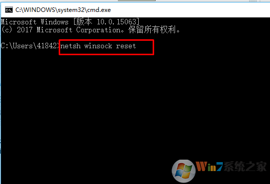 3、在命令提示符中输入netsh winsock reset,回车确定。