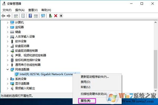 2、在设备管理器窗口,找到并展开电脑网卡,对着它单击鼠标右键,菜单中选择“属性”;
