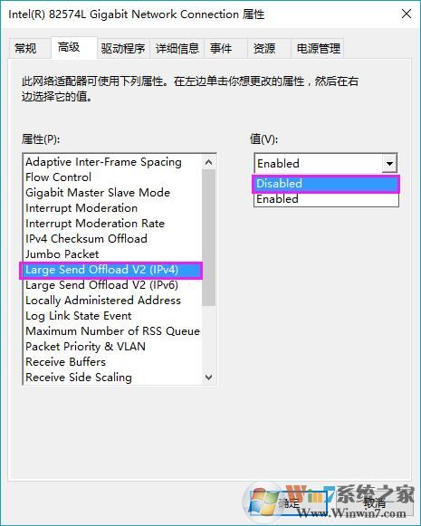 3、在网卡属性对话框,点击切换到“高级”选项卡界面,在“属性”列表中,点击选中“Large Send Offload v2(IPv4)[大型传送分载 v2(IPv4)]”,在窗口右侧,将“值”设置为“Disabled(关闭)”,然后点击底部确定按钮。
