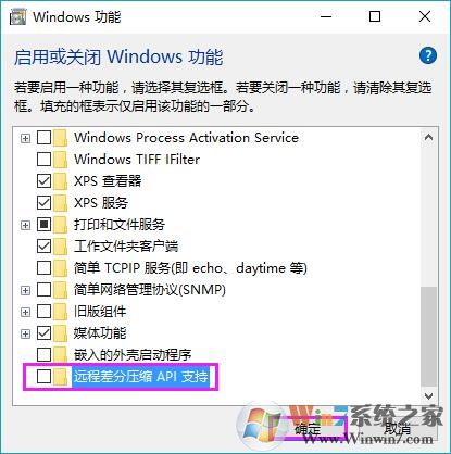 3、在Windows功能窗口,找到“远程差分压缩API支持”,取消前面的勾选后,点击确定,随后会出先一个关闭进度提示窗口,别管他,之后需要重启电脑。