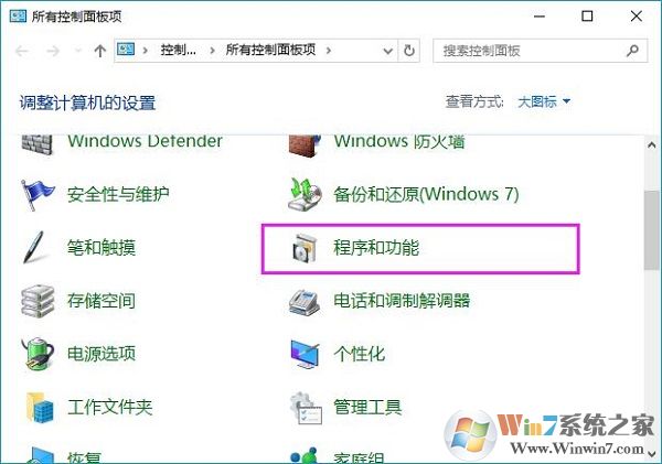 1、在控制面板窗口,大图标查看方式下,找到并点击“程序和功能”;